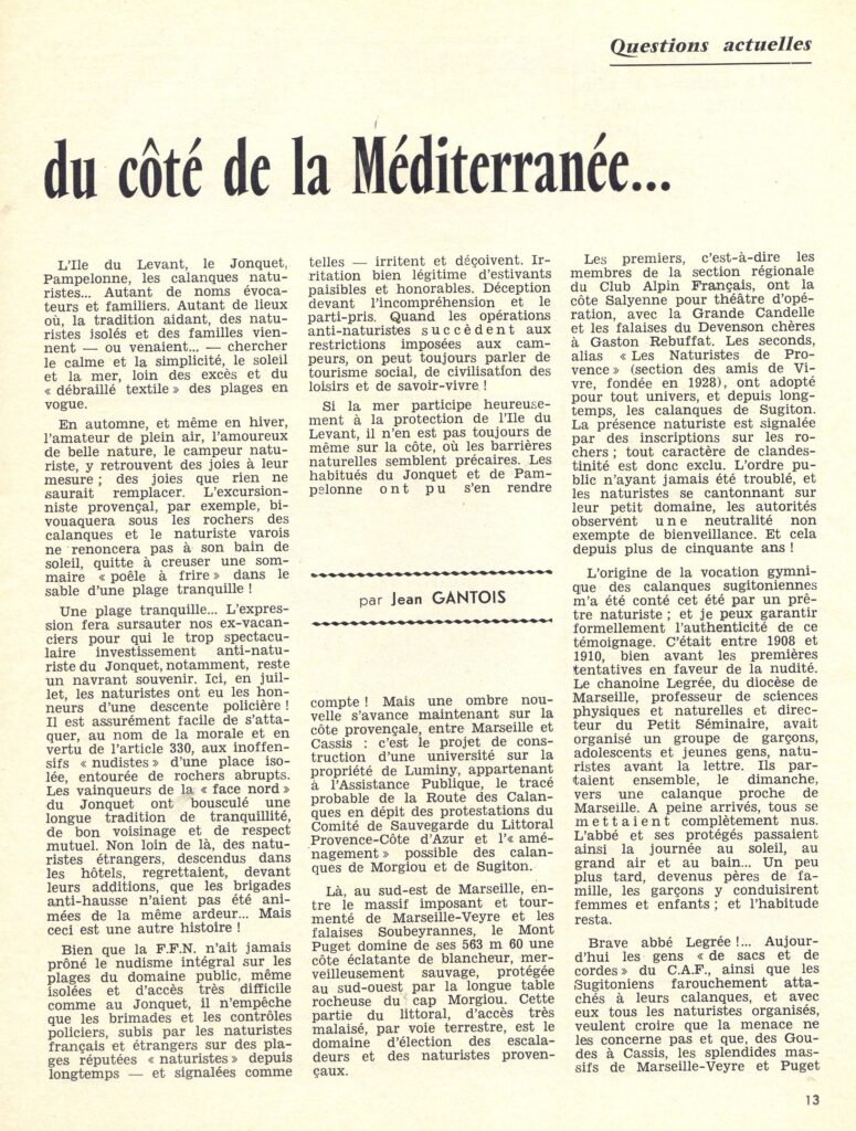 Les Calanques naturistes Auteur/autrice de la publication :13marseilleman13 Publication publiée :11 août 2025 Post category:France Commentaires de la publication :0 commentaire Jean Murat (1916-2000), La Lèque, Calanques de Marseille, juillet 1942, tirage d'époque, collection Bruno Saurez En haut Lazare Friastre et Jean Murat Anonyme, femme nue marchant dans les Calanques, années 1960, tirage d'époque, collection Bruno Saurez Anonyme, femme nue au-dessus de Morgiou, novembre décembre 1983, page centrale de La Vie au Soleil, n°97 Jean Murat (1916-2000) Joseph Wolf, 1942, Aquarelle, collection Pierre Murat Les Pierres Tombées les pierres tombées, 1973 Les Libres Culturistes de Provence à "Sugiton gare", 1955 Claude Vesco - Pierres Tombées, 1981 Les Pierres Tombées, Le Torpilleur, 1967 1962 - La revue naturiste internationale - avril 1962 1962 - La revue naturiste internationale - avril 1962 1962 - La revue naturiste internationale - avril 1962 Vie libre NUM 066 1959 - A l'abri des calanques (La Lèque) 1962 - La revue naturiste internationale - avril 1962 1956 - René Fize dans les Calanques 1956 - René Fize dans les Calanques 1959 - René Fize - Vivre d'abord 1959.N°62.393 1956 - René Fize dans les Calanques Cacau (1935 / 1942) 1964 nov déc - La vie au soleil - numéro 96 Carte topographique 1957-1962 1953 - Calanques Marseille Die Neue Zeit - 1931 Port Pin - 13.03.1984 - Le Provençal 1937.06 - Naturistes avec Poucel en juin 1937 à Sormiou 1930-12-01 Vivre intégralement n°82 1930.05.01 Vivre intégralement - Kayaks Vivre Santé Numéro 195 - 1er juillet 1936 1932-04-15 Vivre intégralement n°115 Carry le Rouet Collection Alain Lartigues Collection Alain Lartigues Collection Alain Lartigues 1932-09-01 Vivre intégralement n°124 Articles Lettre de Louis et Jeanne Souzy, 12 octobre 1972 1962 - La revue naturiste internationale - juillet 1962 1964 nov déc - La vie au soleil - numéro 96 - Jean Gantois 1971 - 22 aout - la marseillaise 1980 Numéro 70 La Vie au Soleil Le Provençal - 13.03.1984 1984 - 08 aout - Le Provençal 2011.07.23 - La Provence - Tout nu dans les calanques 2011.10.26 - Tout nus dans la Sainte Victoire 2010.11 - Naturisme Magazine - Interview Bruno Saurez 2013.08 - L'hebdo 2014.08.02 - La Provence Inguimberty 3 grâces dans les calanques, Inguimberty modèle 1931, Inguimberty Inguimberty et ses modèles Baltus - Eeissadon, 1911 Aquarelles Jean Murat Aquarelle Jean Murat - Grand nu Sugiton,1990 Aquarelle, J. Murat "Le secrétaire" 22-04-1946 à La Lèque J.Murat, Josef Wolf 1945 J.Murat, La lèque 01-03-42 Vue de la dalle des Pierres Tombées avec en premier plan un des rochers des Jumeaux "Le Rocher" La Lèque Le cap Morgiou - mai 1966 Photos anciennes autour de Sugiton 1947 Morgiou 1949 Les Pierres Tombées 1949 le Torpilleur 1949 - Les Jumeaux 1949 - Le Torpilleur 1949 1949 1949 - Vu du belvédère 1949 - Le Torpilleur 1959 Autres photos de la collection Jean Murat - Lieux inconnus Étiquettes: bronzage, Calanques, Carry le rouet, La lèque, les pierres tombées, liberté, Marseille, Naturisme, nudisme, photos, Port Pin, Sugiton Read more articles Article précédentLes Libres Culturistes de Provence Article suivantLes naturistes à l’île du Frioul Vous devriez également aimer Centre international naturiste de méditerranée 11 novembre 2025 Corsicana 28 décembre 2023 Monta avant 18 octobre 2025 Laisser un commentaire Annuler la réponseCommentEnter your name or username to comment Enter your email address to comment Saisir l’URL de votre site (facultatif) Enregistrer mon nom, mon e-mail et mon site dans le navigateur pour mon prochain commentaire.